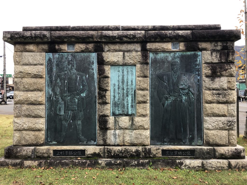 駅近くの南魚沼市役所の入口に、上杉景勝と直江兼続のレリーフがあります。大河ドラマ「天地人」を思い出しました。